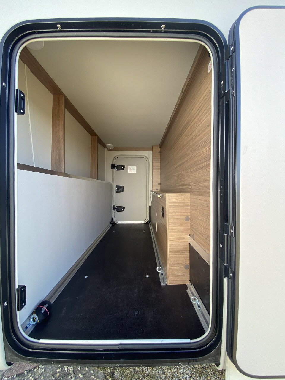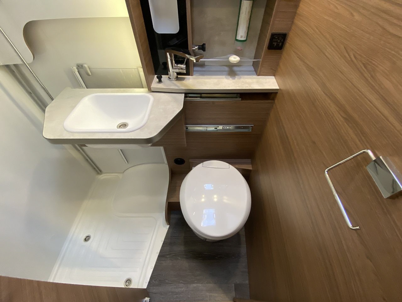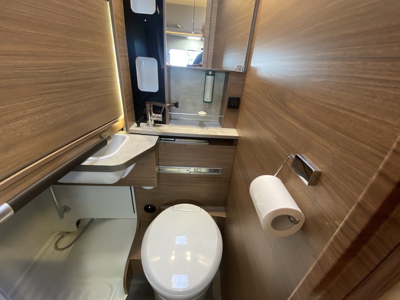 Xpand Bad mit Dusche, klappbaren Duschwänden, verschiebbares Waschbecken, THETFFORD Toilette mit Kassette 19L drehbar, Dachluke 28x28cm für gute Belüftung.