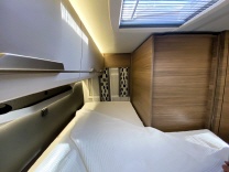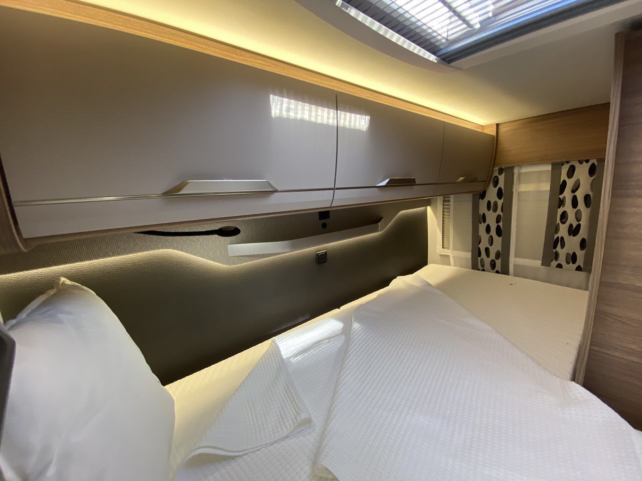 Fixbett im Heck beheizt mit Liegefläche 200 x 135cm. Unterlüftung/Lattenrost, gute Belüftung durch 2 Ausstellfenster und 1 40x40cm Dachluke - Leselampen und indirektes Ambientelicht